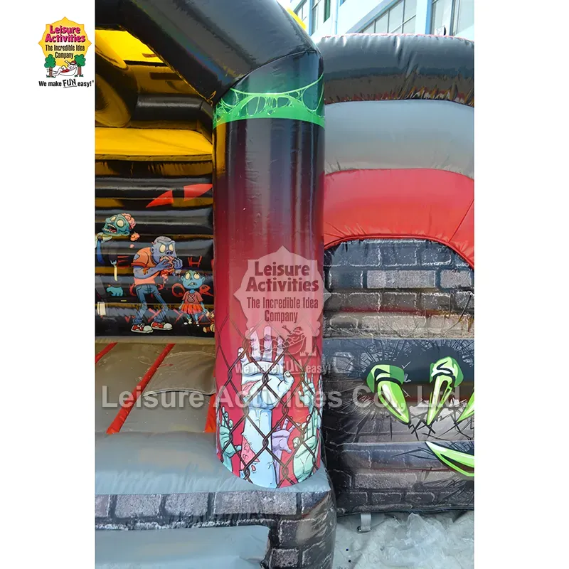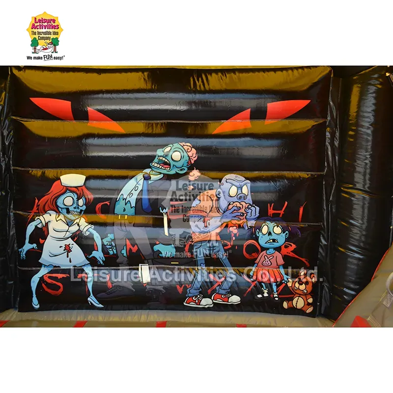 Kleine aufblasbare Multiplay-Hüpfburgen „Haunted Combo“ mit Rutsche: Diese „Haunted Combo“-Hüpfburg mit Zombie-Thema wurde entwickelt, um Kinder mit ihrer aufregenden Cartoon-Horror-Ästhetik zu fesseln. Die kräftige Kombination aus kräftigen Rottönen, glänzenden Schwarztönen und unheimlichen Grün- und Blautönen schafft eine lebendige, aufregende Umgebung. Große, verspielte Grafiken von Comic-Zombies in dynamischen Posen – wie einer Krankenschwester, einer gehirnfressenden Figur und einem Zombie-Kind mit Teddybär – machen mehr Spaß als Angst zu machen. Interaktive Elemente wie der große blaue Zombie, der auf dem Dach kriecht, Krallenhände, die durch Wände brechen, und Ketten/Grafiken auf Säulen regen zum fantasievollen Spielen an. Die geschlossene Struktur mit einer schützenden oberen Abdeckung sorgt für Schatten und leichten Regenschutz, während die geschlossene Rutsche für noch mehr Abenteuer sorgt. Die Höhe von 10 Fuß macht es vielseitig einsetzbar für den Innen- und Außenbereich und eignet sich perfekt für Halloween-Partys, Herbstfeste, thematische Geburtstagsveranstaltungen und gruseligen Hinterhofspaß.